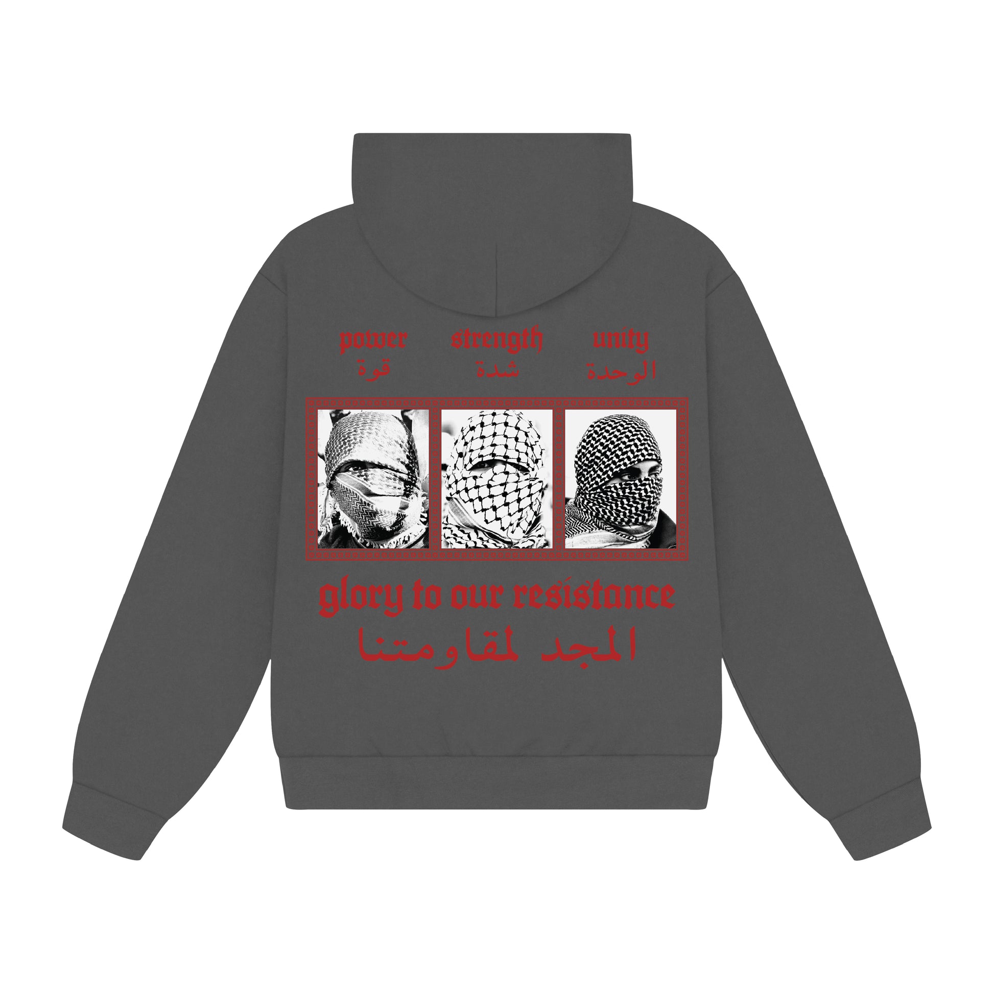 Back features English and Arabic script reading "power", "strength", "unity", and "glory to our resistance"